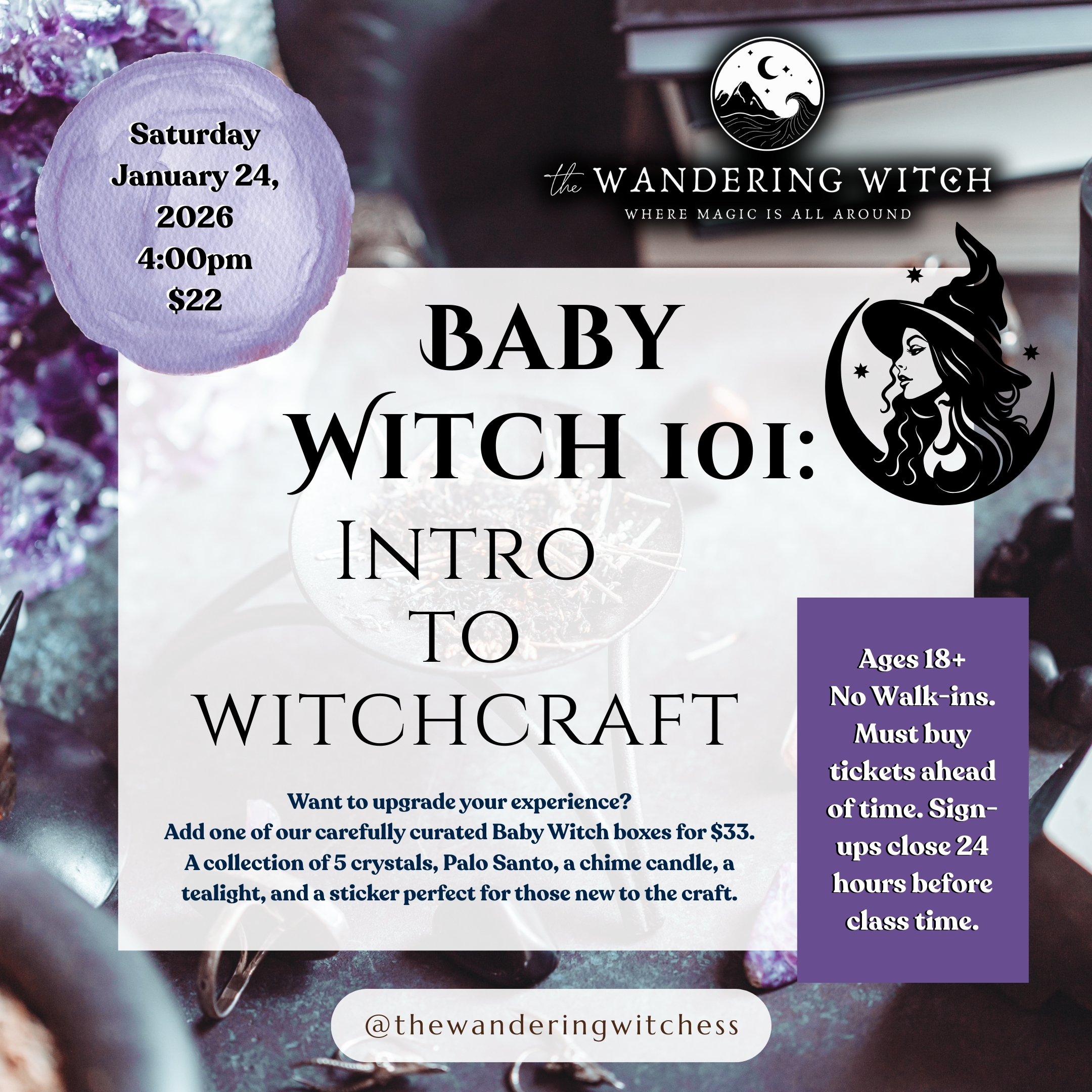 Are you ready to dive into the world of magic but not sure where to start? Our most popular introductory class, Baby Witch 101, is the perfect place to begin and you can now join in person or remotely!